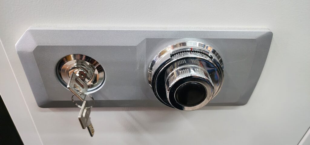 - Lock Type: Mechanical Spin Dial Lock and Key (both must be used to open safe)