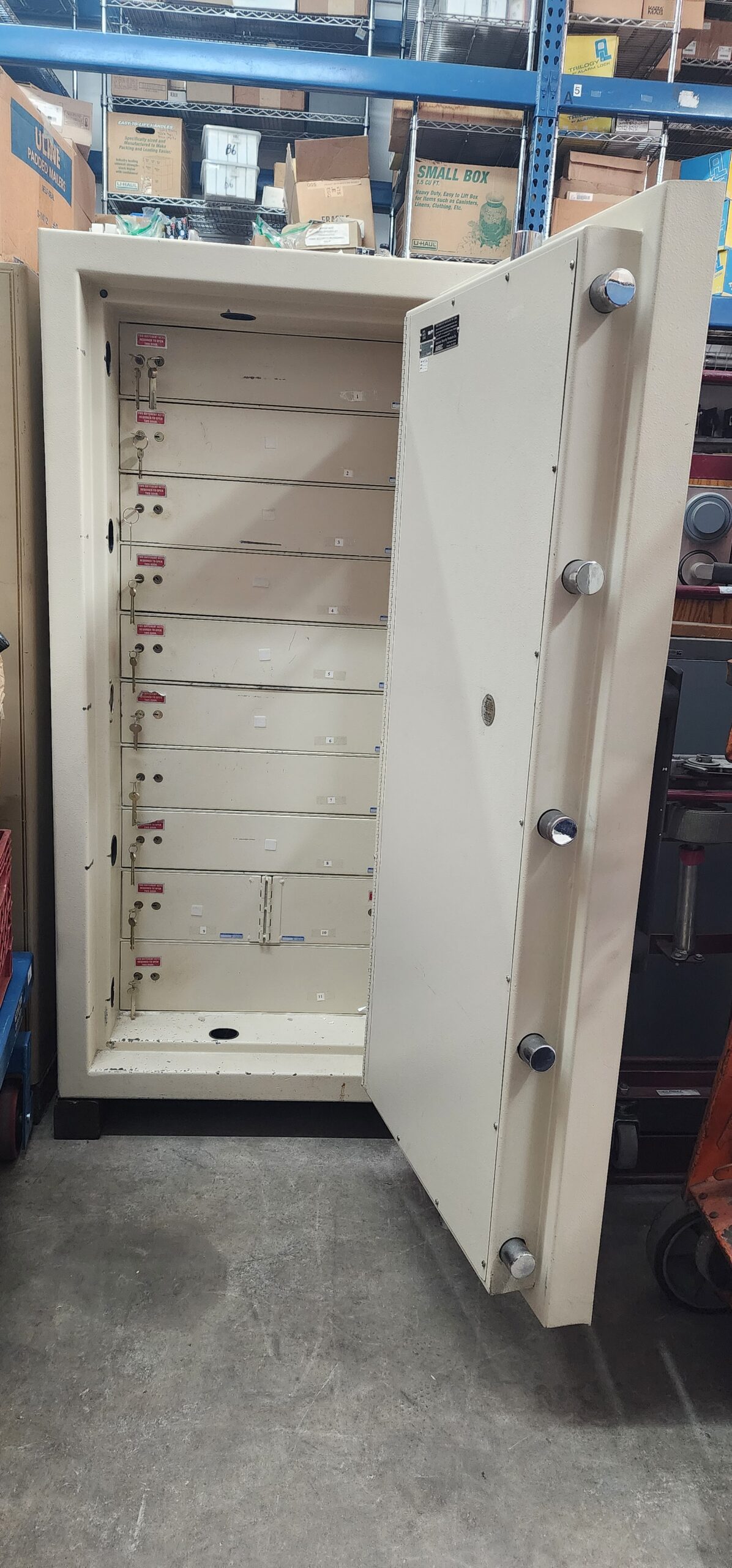 The interior is fitted with six dual-key compartments for cash drawer storage and two large compartments with rungs for adjustable shelving